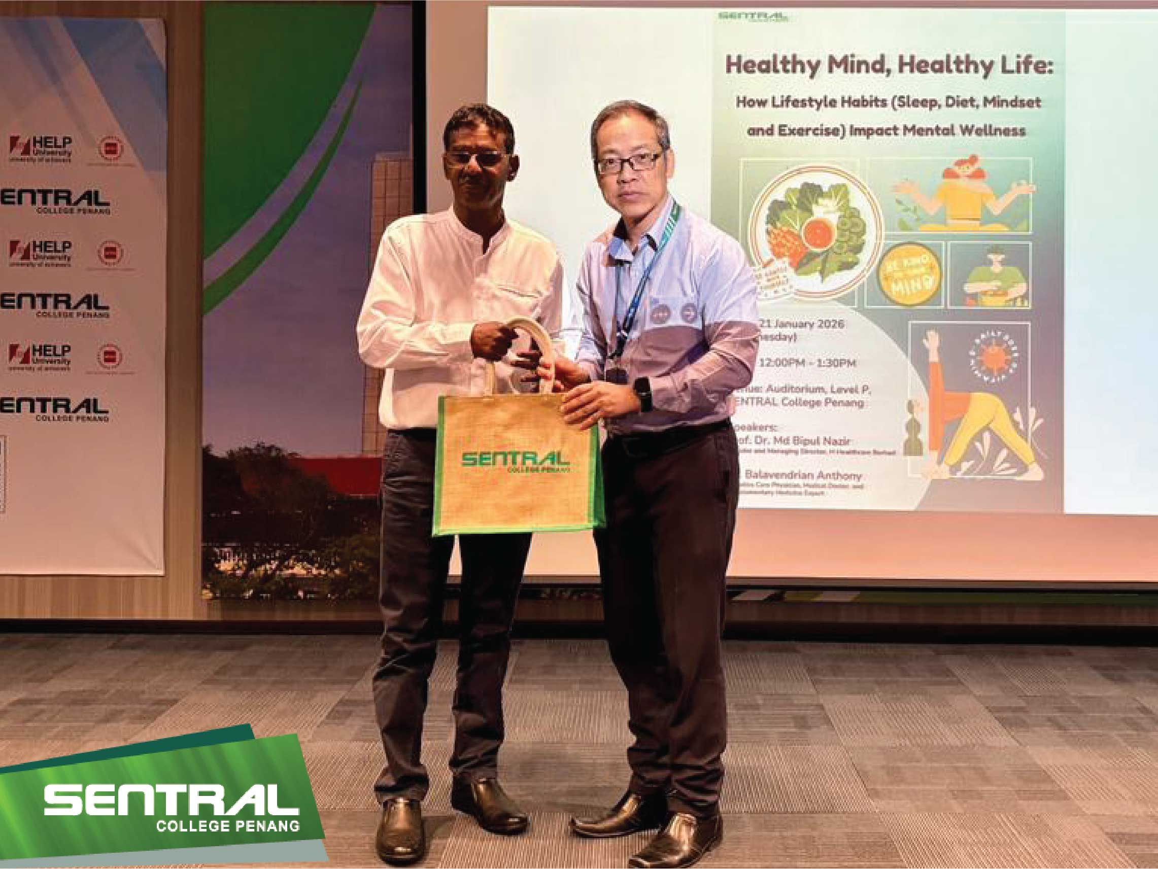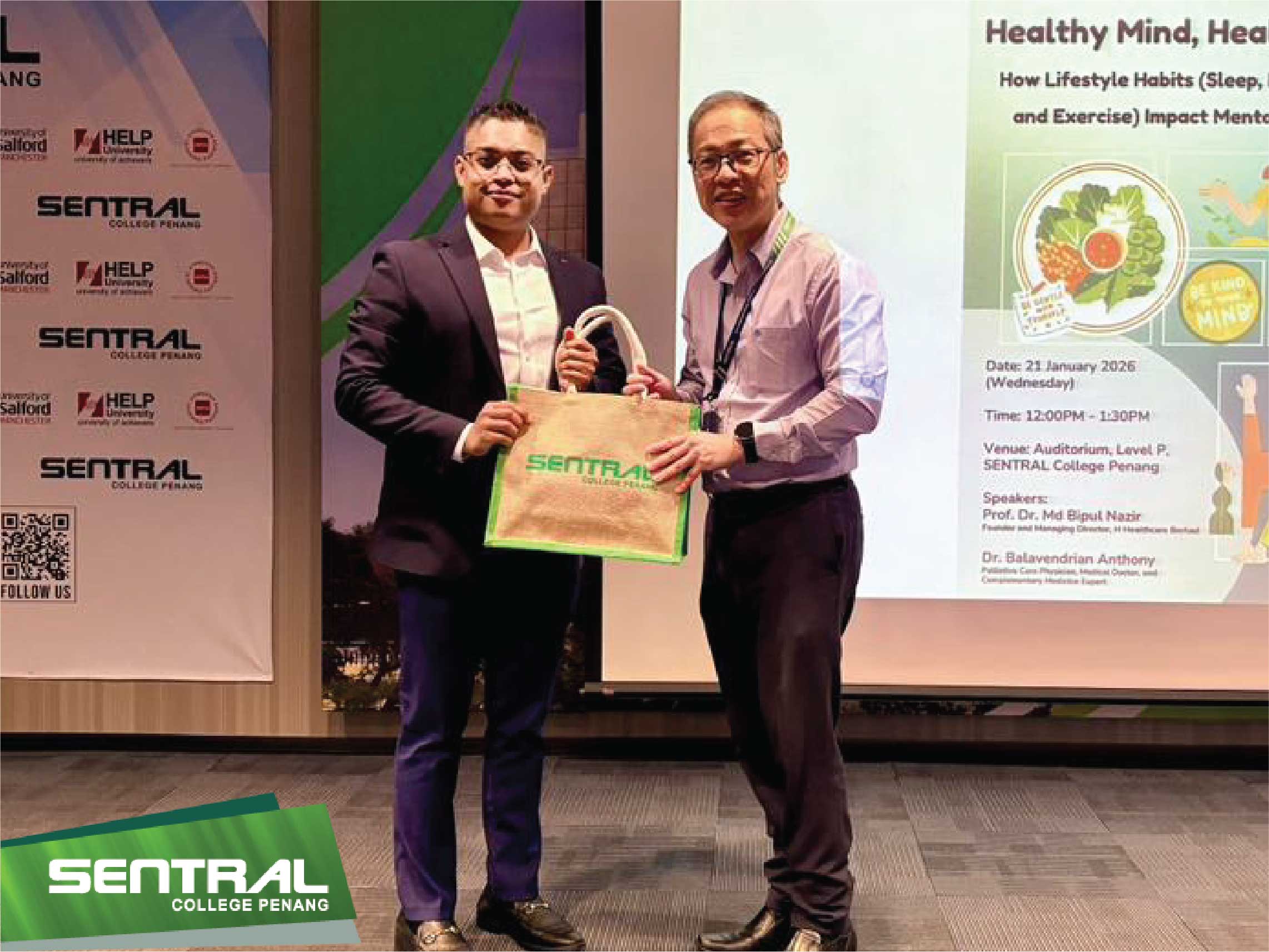 On 21/1/2026, SENTRAL College Penang had the honour of hosting an enriching Health & Wellness Talk. Titled “Healthy Mind, Healthy Life: How Lifestyle Habits (Sleep, Diet, Mindset, and Exercise) Impact Mental Wellness” the session brought to light the powerful connection between our daily routines and mental well-being.